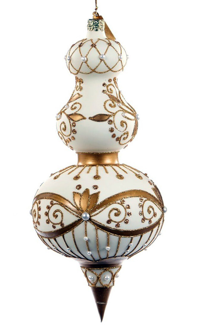 Предлагаем вашему вниманию стилизованные елочные шары ручной работы из белого матового стекла с золотым узором, высотой 15 сантиметров.
